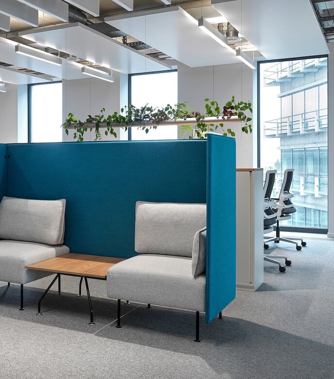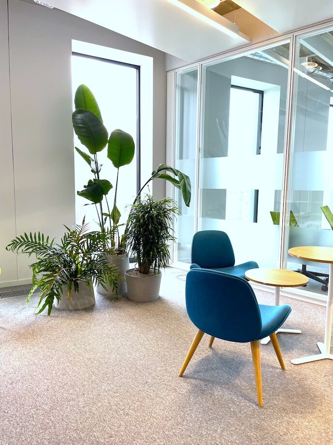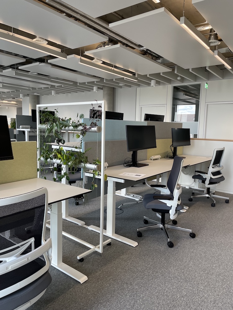 In den Büro- und Meetingbereichen wurde mit Pflanzenröhren eine elegante Hängebegrünung über den Tischen integriert. Die sanft herabhängenden Pflanzen schaffen eine geschützte, inspirierende Atmosphäre und fördern konzentriertes Arbeiten sowie kreative Besprechungen. Gleichzeitig verbessern sie die Aufenthaltsqualität und setzen moderne, lebendige Akzente im Raum.
