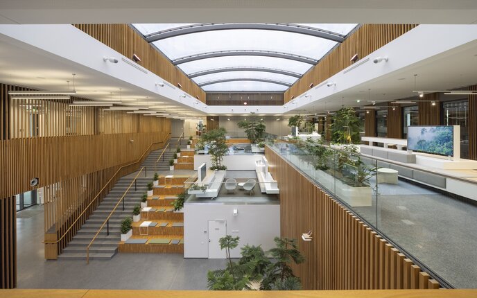 Im zentralen Atrium setzen eindrucksvolle Koniferen ein starkes gestalterisches Zeichen. Sie verleihen dem Raum eine natürliche Präsenz, der Besucher und Mitarbeitende gleichermassen empfängt. Das Grün schafft Orientierung, verbessert die Raumakustik und trägt spürbar zu einem angenehmen Mikroklima bei.